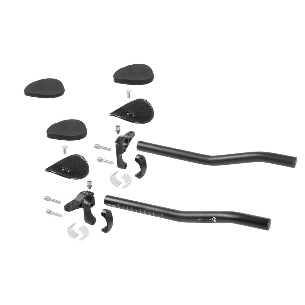 Tri bar, M WAVE ´´AERO F´´, aleación, negro, para manillar de 31.8 mm, con adaptador para 25.4 mm, con clip en el reposabrazos (ancho ajustable) y almohadillas desmontables, brazos ligeramente doblados con escala, en la tarjeta